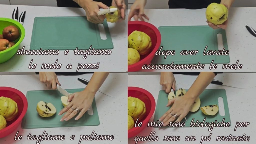 • Zuerst wasche, schäle und schneide die Äpfel in Stücke. Wasche auch die Quitten gut, reinige sie und schneide sie ebenfalls (meine sind etwas beschädigt, weil sie biologisch sind).