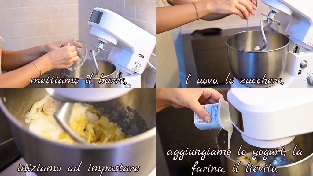 Butter, Ei und Zucker in eine Schüssel geben und beginnen zu kneten. Joghurt, Mehl und Backpulver hinzufügen