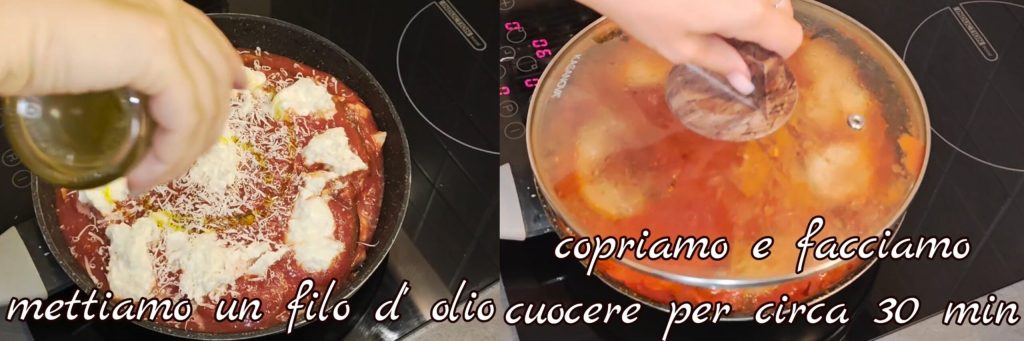 Wir geben etwas Tomatenpassata, Salz, etwas Mozzarella, etwas geriebenen Parmesan dazu und beginnen von vorne mit den Auberginen, indem wir so weitermachen, bis die Zutaten aufgebraucht sind.