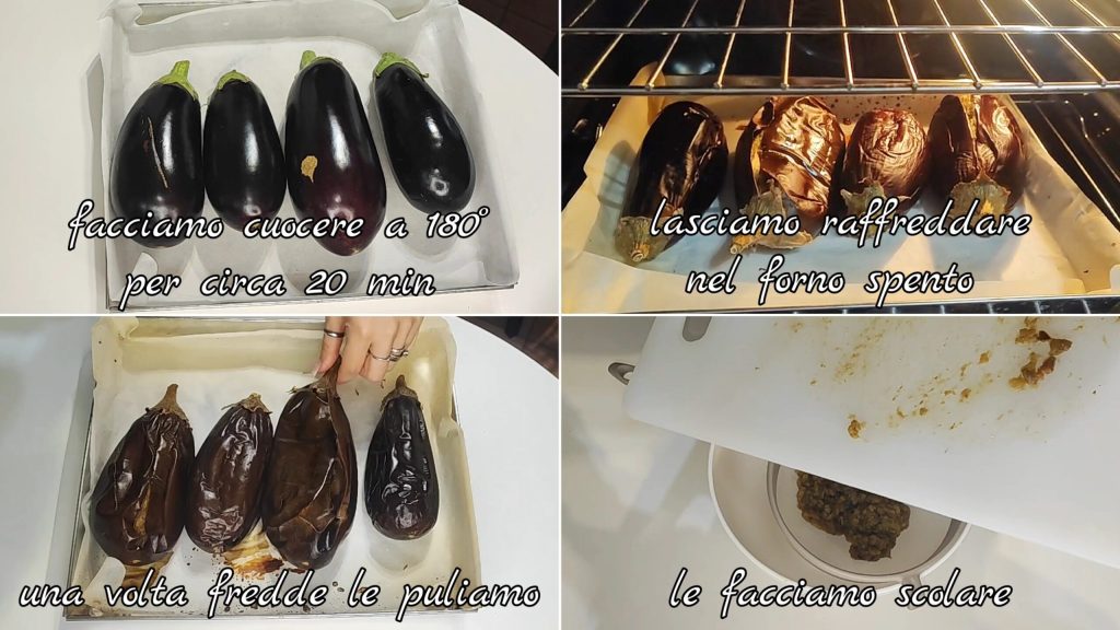 Zuerst backen wir die Auberginen bei 180° für etwa 20 Minuten, dann lassen wir sie im ausgeschalteten Ofen abkühlen. Sobald sie abgekühlt sind, schälen wir sie und hacken sie fein. Wir geben sie in ein Sieb und lassen sie abtropfen.