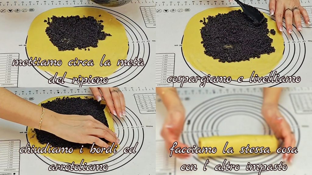 Nach etwa 30 Minuten… nehmen wir die Hälfte des Teigs und rollen ihn aus.Wir legen die Hälfte der vorbereiteten Füllung darauf und rollen sie auf. Dasselbe machen wir mit der anderen Hälfte des Teigs