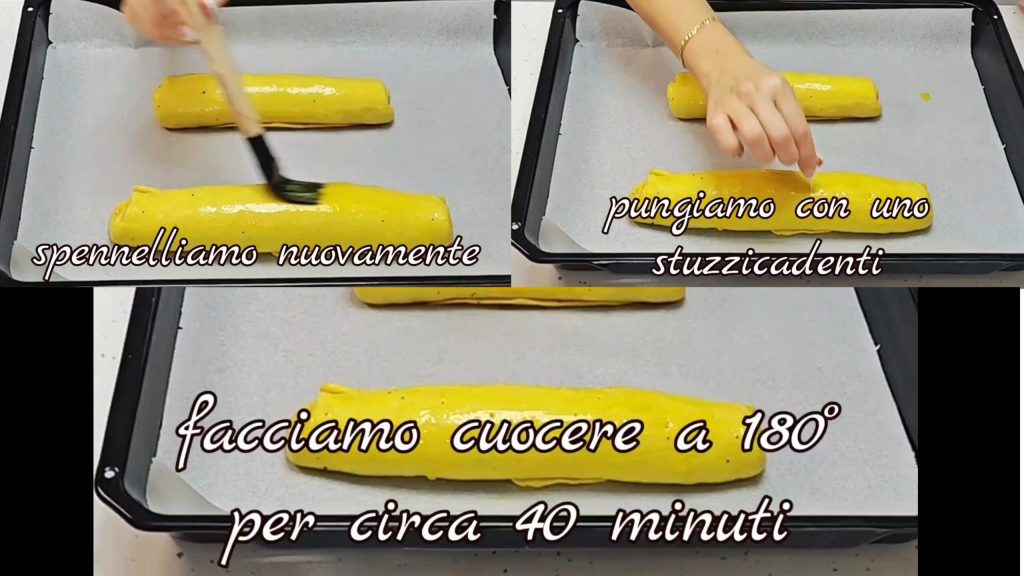 wir bestreichen sie erneut mit Ei, dann stechen wir sie mit einem Zahnstocher ein. Wir backen sie bei 180° etwa 40 Minuten lang.