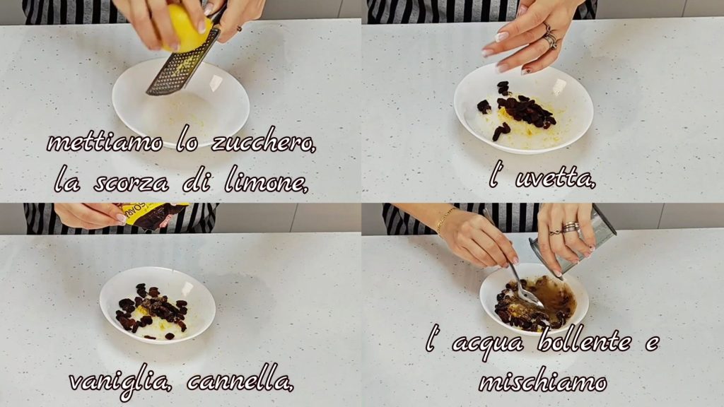Wir geben den Zucker, die Zitronenschale, die Rosinen, Vanille, Zimt und das kochende Wasser hinzu und mischen.