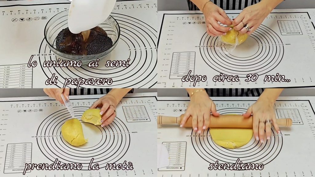Wir fügen die Hefe hinzu und mischen. Wir fügen sie nach und nach beim Kneten hinzu. Wir wickeln den erhaltenen Teig in Folie und stellen ihn etwa 30 Minuten in den Kühlschrank.
