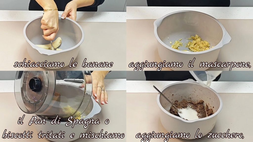Zerdrücke die Bananen, füge den Mascarpone und den Biskuit oder die zerbröselten Kekse hinzu und mische. Füge den Zucker hinzu.
