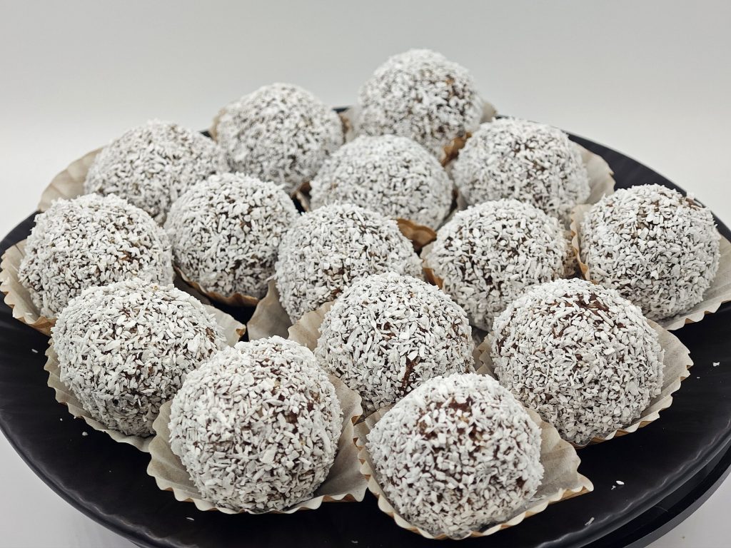Gib den geriebenen Kokos hinzu und mische gut, bis eine homogene Masse entsteht. Nimm etwas von der Masse, forme Kugeln und wälze sie dann im Kokos. Platziere sie in Papierförmchen.