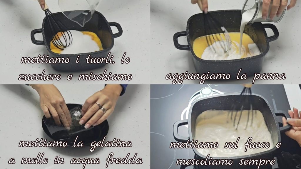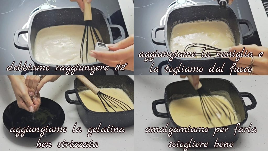 Wir müssen 82°C erreichen, dabei ständig rühren. Etwas Vanille hinzufügen, vom Herd nehmen und die ausgedrückte Gelatine hinzufügen. Gut vermengen,