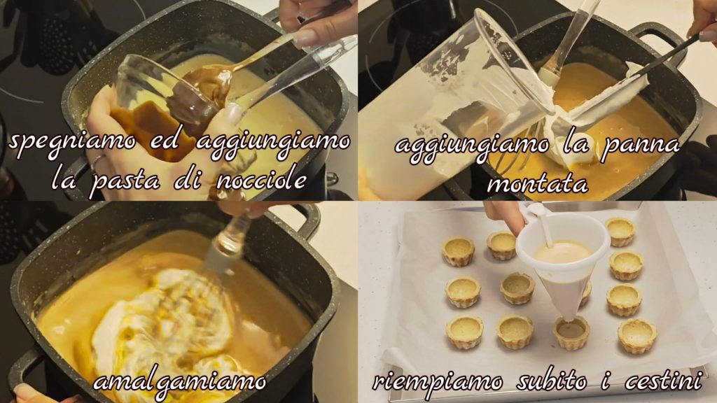 Abschalten und die Haselnusspaste und die Schlagsahne hinzufügen. Die Körbchen sofort mit der erhaltenen Mischung füllen.