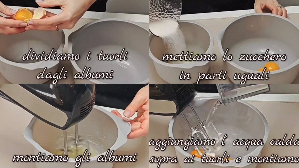 Zuerst trennen wir die Eigelbe von den Eiweißen. Wir fügen den Zucker zu gleichen Teilen hinzu. Wir beginnen, die Eiweiße mit einem elektrischen Mixer zu schlagen. Wir geben das heiße Wasser über die Eigelbe und beginnen zu schlagen.