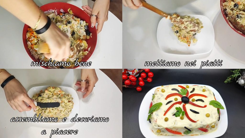 Alles gut vermischen. Die entstandene Mischung auf Tellern anrichten und nach Belieben dekorieren. Ich habe eine dünne Schicht Mayonnaise hinzugefügt und Dekorationen mit schwarzen Oliven, Erbsen, eingelegten Paprika, Basilikum und Petersilie gemacht!