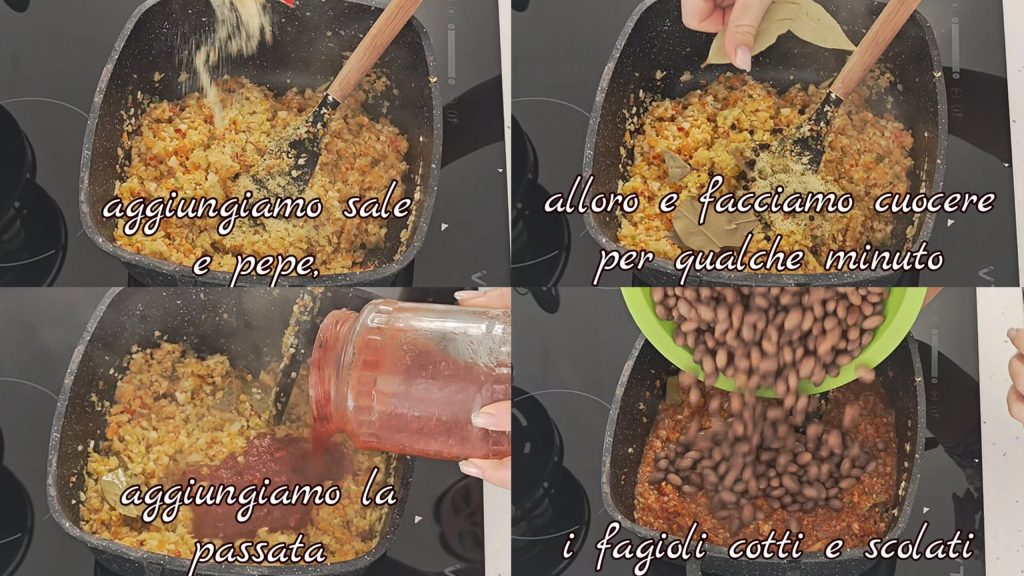 Wir fügen Salz, Pfeffer, Lorbeer hinzu und lassen es ein paar Minuten kochen, dann geben wir auch die Tomatenpassata dazu. Wir fügen die gekochten und abgetropften Bohnen hinzu.