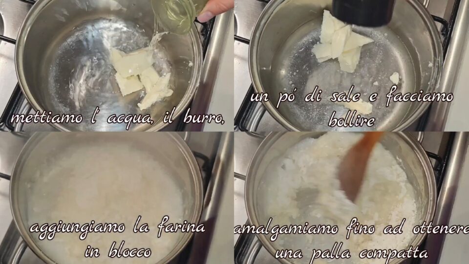 In einem Topf geben wir das Wasser, etwas Salz, die Butter und lassen es aufkochen. Wir fügen das Mehl hinzu und mischen, bis wir einen kompakten Ball erhalten.Sobald sich eine Kruste bildet, schalten wir aus und lassen den Teig in der Küchenmaschine abkühlen, indem wir sie auf niedriger Geschwindigkeit drehen lassen. Wenn es lauwarm wird, beginnen wir, die Eier nach und nach hinzuzufügen und lassen sie gut einarbeiten, bevor wir die anderen hinzufügen.