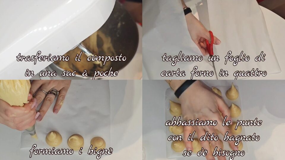 Wir füllen die erhaltene Masse in einen Spritzbeutel. Wir schneiden ein Blatt Backpapier in vier Teile und formen die Brandteigkrapfen. Wenn nötig, drücken wir die Spitzen mit einem nassen Finger herunter.