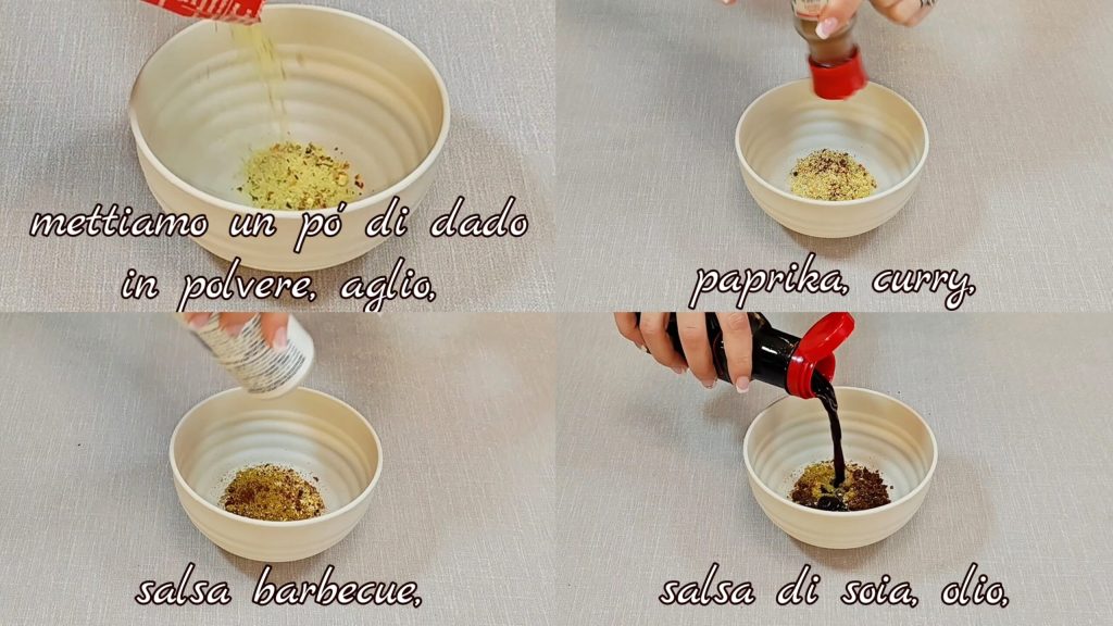 • In einem Behälter etwas Brühwürfelpulver, Knoblauch, Paprika, Curry, Barbecuesoße, Sojasoße, Öl geben
