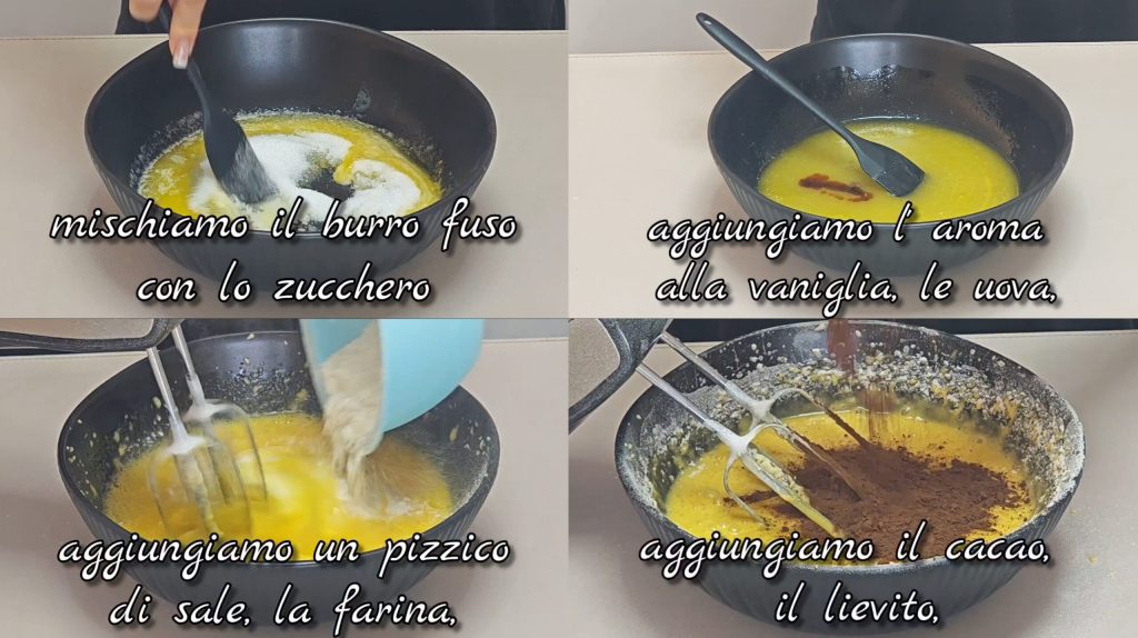 Bereite die Basis vor: In einer Schüssel die geschmolzene Butter mit dem Zucker vermischen. Vanillearoma, Eier und eine Prise Salz hinzufügen und gut verrühren. Mehl zugeben, dann Kakao und Backpulver untermengen.