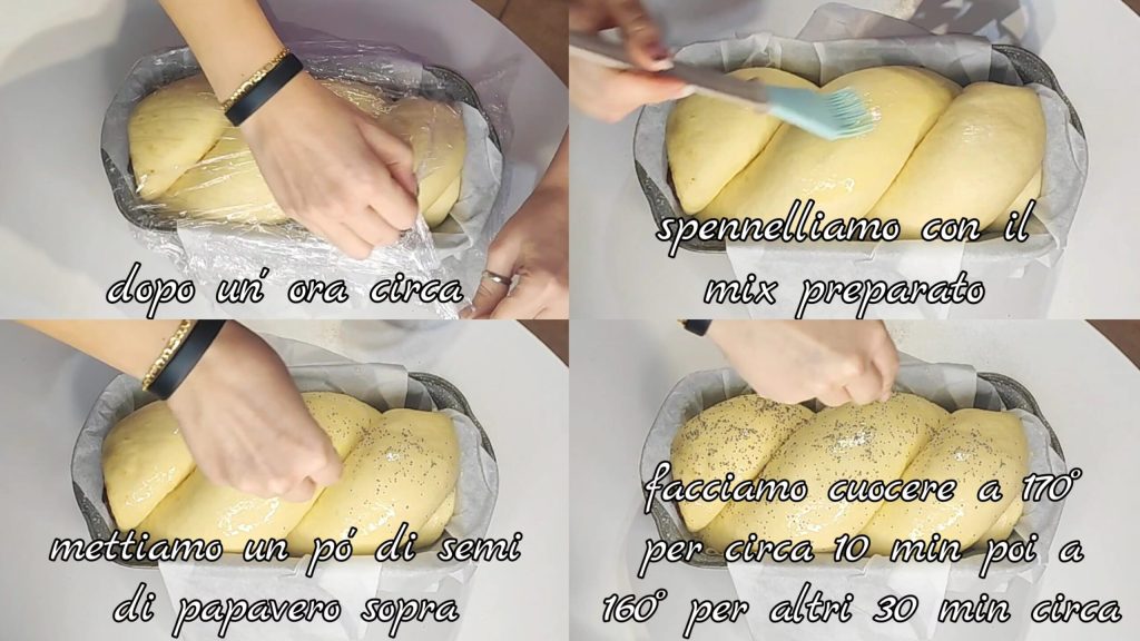 Wir flechten sie miteinander. Wir legen es in die Form (eine Kastenform) und bedecken es mit Frischhaltefolie, lassen es noch eine Stunde lang aufgehen.