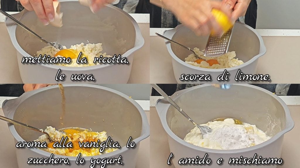 Mische Ricotta, Eier, Zitronenschale, Vanille, Zucker, Joghurt und Maisstärke.