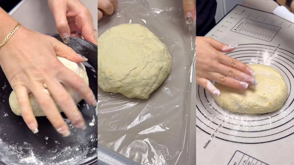 • Wir formen einen Kloß, wickeln ihn in Frischhaltefolie ein und lassen ihn etwa 30 Minuten ruhen.