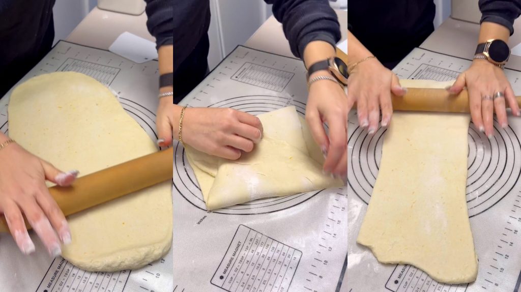 • Wir teilen den Teig in zwei Hälften und rollen eine sehr dünne Schicht aus. Wir schneiden Rechtecke und machen die klassischen zwei mittleren Einschnitte.