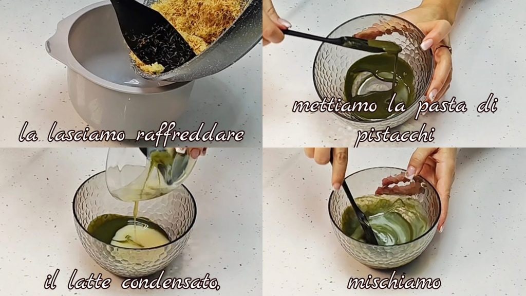 Sobald sie fertig ist, geben wir sie in einen Behälter und lassen sie abkühlen. In einen Behälter geben wir die Pistaziencreme, die Kondensmilch und mischen.