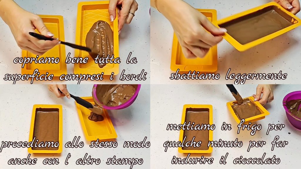 Wir bedecken die gesamte Oberfläche einschließlich der Ränder gut. Wir klopfen leicht, um das Niveau auszugleichen, und stellen sie dann für ein paar Minuten in den Kühlschrank, um die Schokolade hart werden zu lassen.