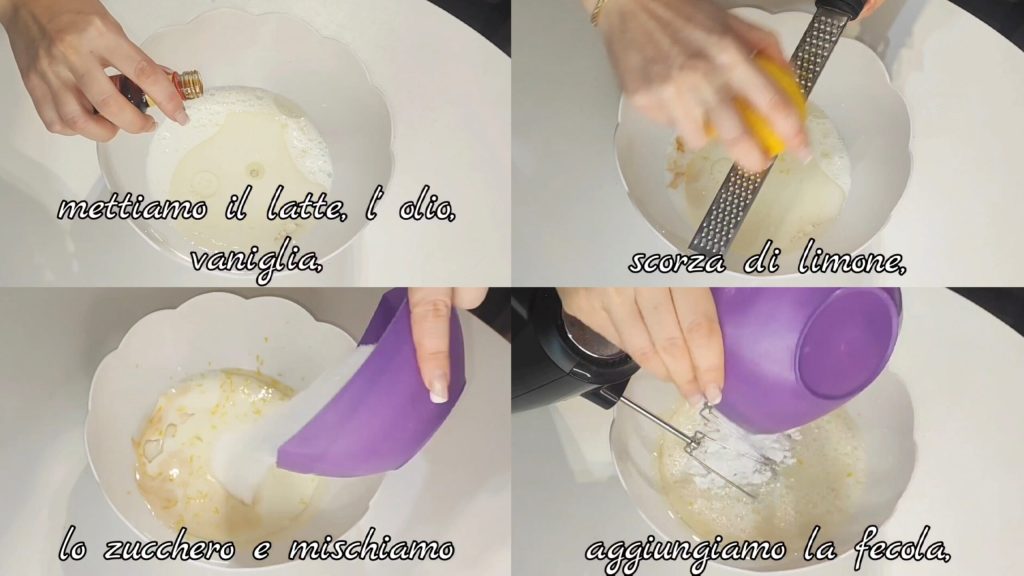 In einer Schüssel mischen wir Milch, Öl, Vanille, Zitronenschale, Zucker und mischen. Wir fügen die Kartoffelstärke hinzu.