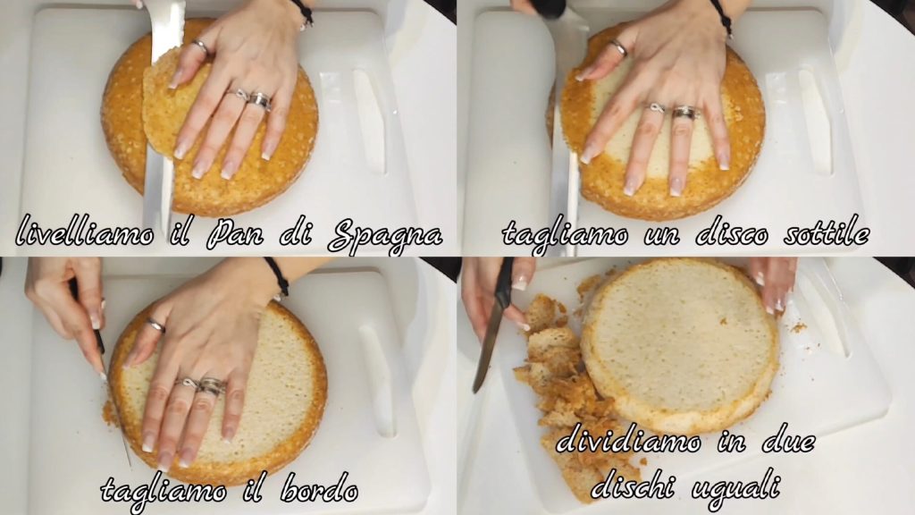 Sobald es gebacken und abgekühlt ist, nehmen wir es aus der Form, glätten es, indem wir die Kappe abschneiden, falls nötig, dann schneiden wir eine dünne Scheibe ab und auch die Kruste am Rand, dann teilen wir es in zwei gleiche Scheiben.
