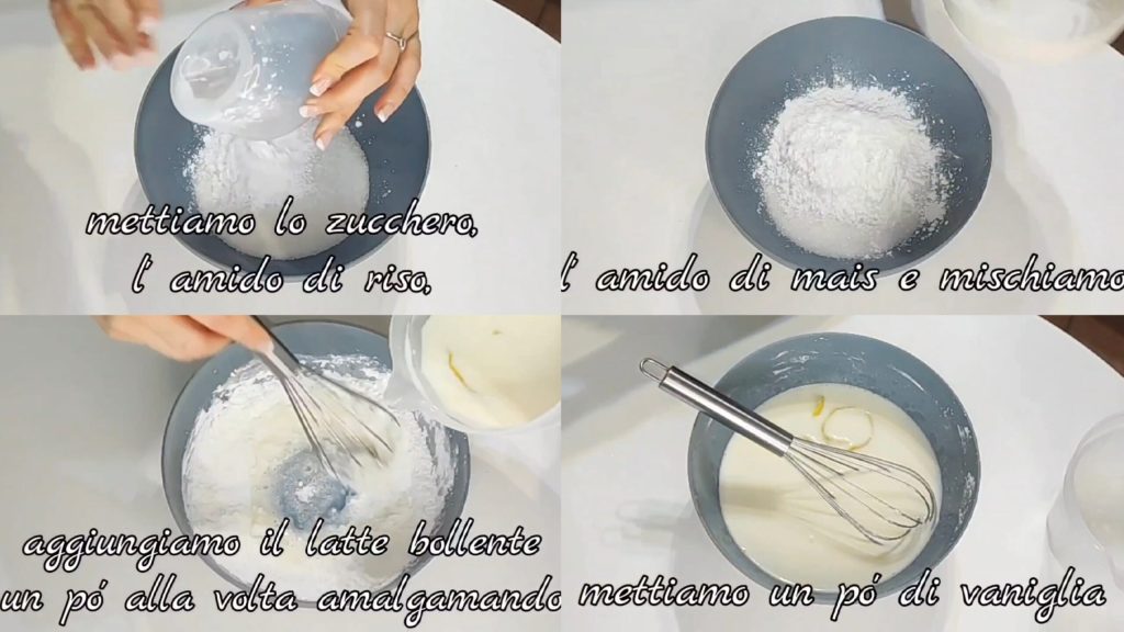 In einer Schüssel mischen wir Zucker, Reisstärke, Maisstärke und mischen. Wir fügen nach und nach die heiße Milch hinzu und rühren dabei. Wir fügen etwas Vanille hinzu.