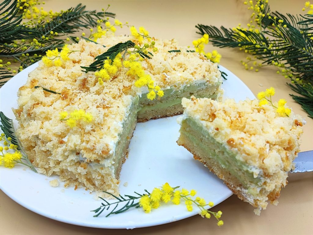 Eine weitere Mimosa-Torte ohne Eier, gefüllt mit einer köstlichen Pistaziencreme, ebenfalls ohne Eier ☺️ und dann mit Würfeln bedeckt. Ein sehr einfaches Rezept, das wir alle zu Hause zubereiten können.