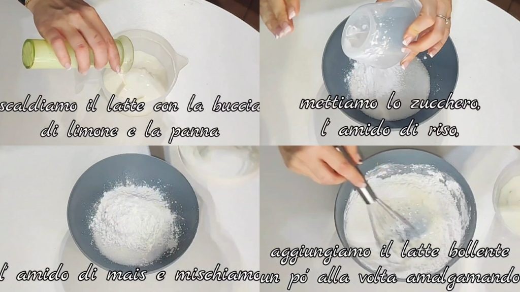In einem Gefäß geben wir die Milch, die Sahne und die Zitronenschale und erhitzen sie gut (kurz vor dem Siedepunkt). In einem anderen Gefäß geben wir die Pulver: Zucker, Reisstärke, Maisstärke und mischen. Wir fügen die heiße Milch nach und nach hinzu und mischen gut, um Klumpenbildung zu vermeiden.