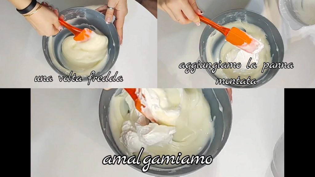 Einmal kalt, fügen wir die Schlagsahne hinzu und mischen sie vorsichtig unter.
