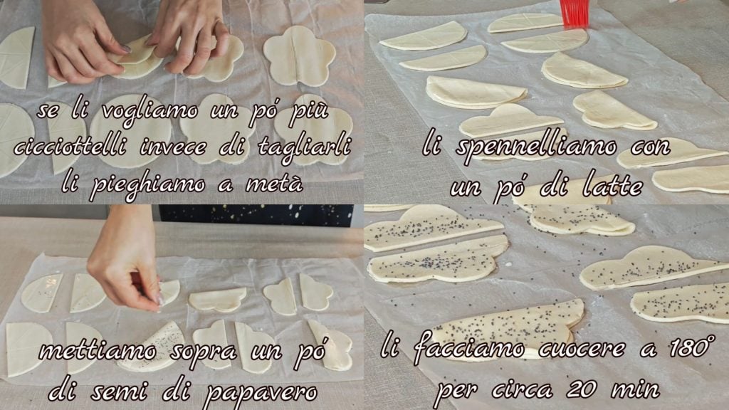 Wenn wir sie etwas dicker haben möchten, falten wir sie anstelle des Schneidens in der Mitte. Wir bestreichen sie mit etwas Milch und streuen Mohnsamen darüber. Dann backen wir sie bei 180° für etwa 20 Minuten.