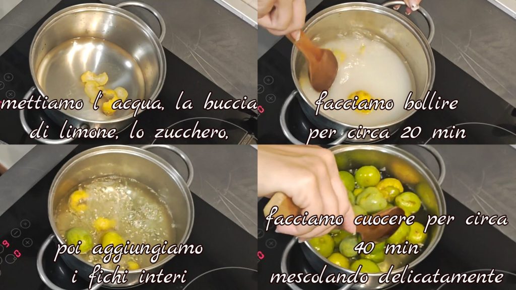 In einem Topf geben wir Wasser, Zitronenschale, Zucker und lassen es etwa 20 Minuten kochen. Dann fügen wir die zuvor gewaschenen ganzen Feigen hinzu und lassen sie etwa 40 Minuten lang unter gelegentlichem, vorsichtigem Rühren kochen.