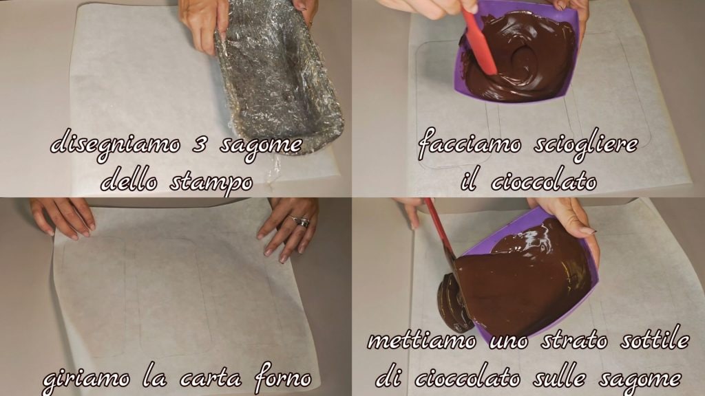 Zuerst nehmen wir ein Blatt Backpapier und zeichnen mit einem Bleistift drei Umrisse der Form, die wir verwenden werden. In der Zwischenzeit schmelzen wir die Schokolade und verteilen eine dünne Schicht auf jedem Umriss (wir müssen sie in 4 Teile teilen).