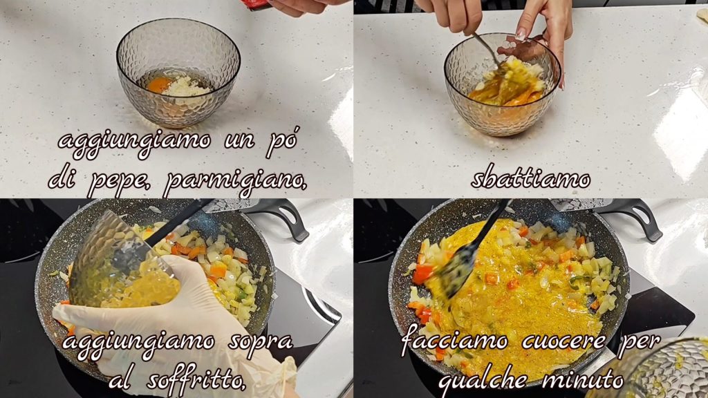 Fügen wir etwas Pfeffer, Salz, Parmesan hinzu und schlagen mit einer Gabel. Wir geben die Mischung über das angebratene Gemüse. Kochen lassen für ein paar Minuten