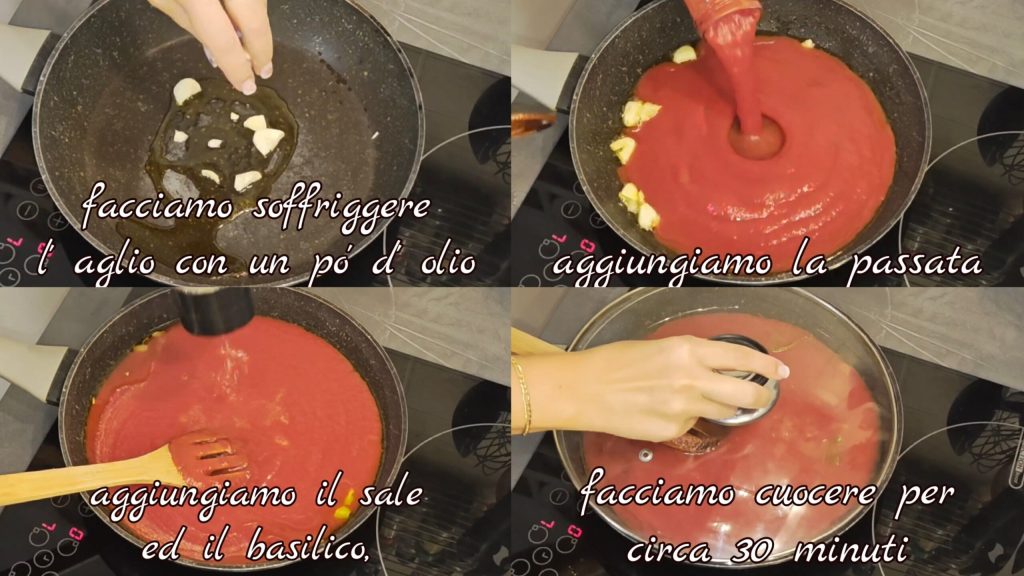 In einem großen Topf den ganzen Knoblauch in 2-3 Esslöffeln nativem Olivenöl extra anbraten. Gib die passierten Tomaten, Basilikum und eine Prise Salz hinzu. Lass es bei niedriger Hitze etwa 30 Minuten köcheln.