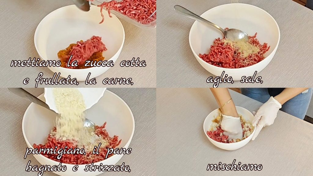 In einer Schüssel geben wir den gekochten und pürierten Kürbis, das Fleisch, Knoblauchpulver, Salz, den Parmesan, das eingeweichte und ausgedrückte Brot hinzu und mischen alles gut mit den Händen.