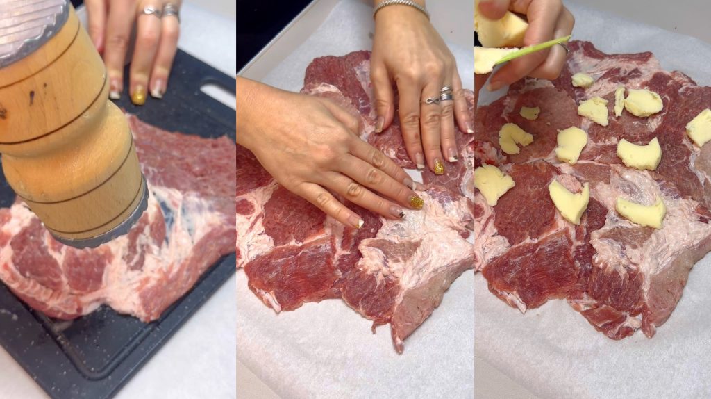 Legt ein Backpapier auf die Arbeitsfläche und legt die Koteletts nebeneinander leicht überlappend, sodass ein kompakter Fleischrechteck entsteht.