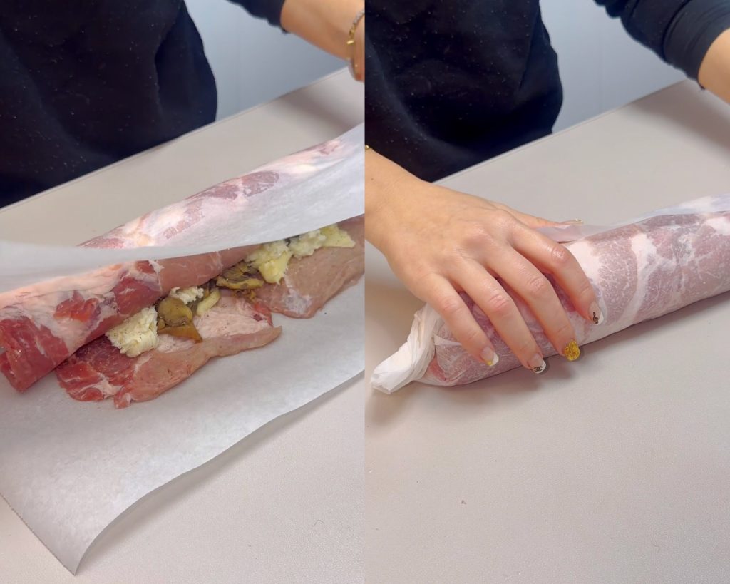 Mit Hilfe des Backpapiers rollen wir das Fleisch zu einer kompakten Rolle auf.