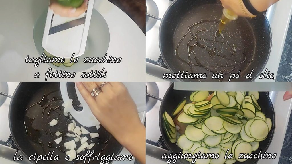 Zuerst reinigen, waschen und schneiden wir die Zucchini in dünne Scheiben mit einer Mandoline. In einer Pfanne geben wir etwas Öl, Zwiebel und braten es an. Fügen Sie die geschnittenen Zucchini hinzu.