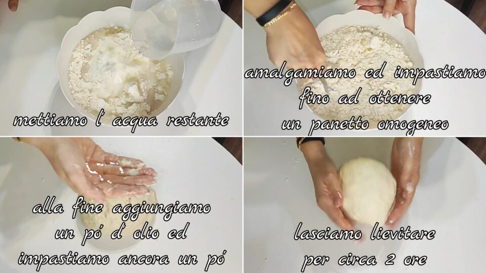Wir fügen das restliche Wasser hinzu und vermischen und kneten, bis wir einen homogenen Teig erhalten. Am Ende geben wir etwas Öl dazu und kneten noch einige Minuten weiter. Lassen Sie es etwa 2 Stunden an einem warmen Ort gehen.