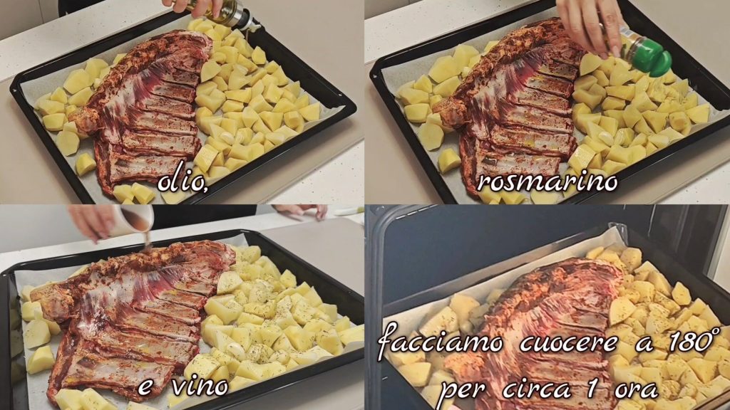Wir fügen etwas Öl, Rosmarin und Wein hinzu. Wir lassen es bei 180° etwa eine Stunde lang garen!