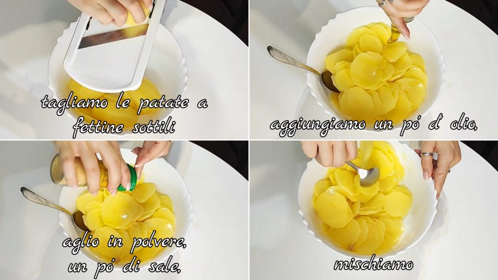 Zuerst reinigen, waschen und die Kartoffeln in dünne Scheiben schneiden. Fügen Sie etwas Öl, Knoblauchpulver, etwas Salz hinzu und mischen Sie.