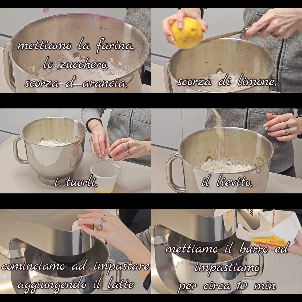 Wir geben Mehl, Zucker, Orangenschale, Zitronenschale, Eigelbe und Hefe in eine Schüssel und beginnen mit dem Kneten, indem wir nach und nach die Milch hinzufügen. Dann fügen wir die Butter hinzu und kneten etwa 10 Minuten lang.
