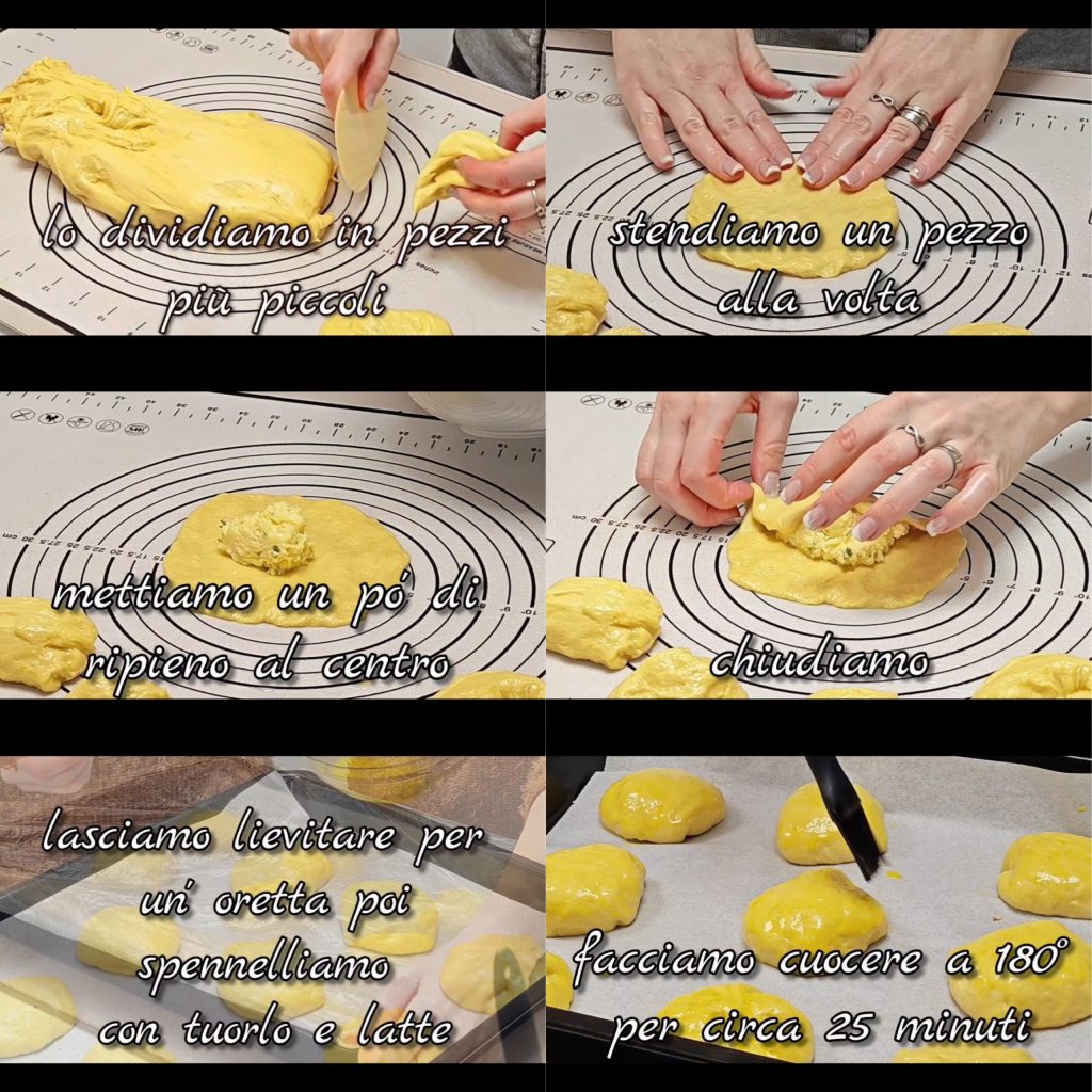 teilen ihn in kleinere Stücke. Wir rollen jedes Stück aus, geben etwas Füllung in die Mitte und schließen es. Wir verfahren so mit allen. Dann decken wir sie ab und lassen sie etwa eine Stunde lang aufgehen, bevor wir sie mit Eigelb und Milch bestreichen. Wir backen sie bei 180° etwa 25 Minuten lang.