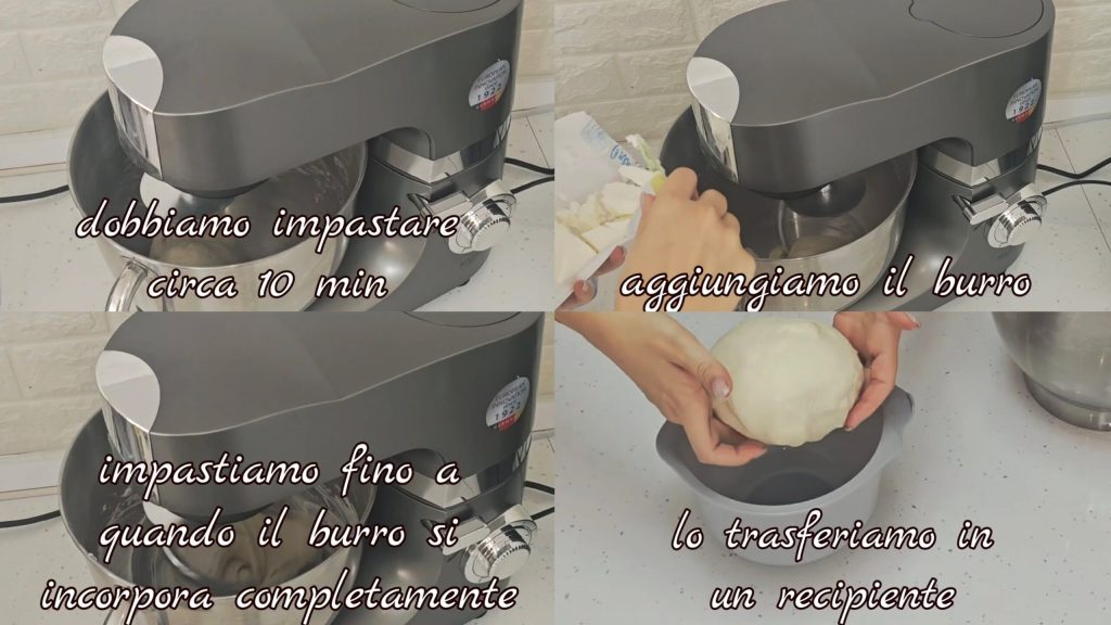 etwa 10 Minuten kneten. Dann die kalte Butter hinzufügen und weiterkneten, bis sie vollständig eingearbeitet ist. Den Teig in eine Schüssel geben,