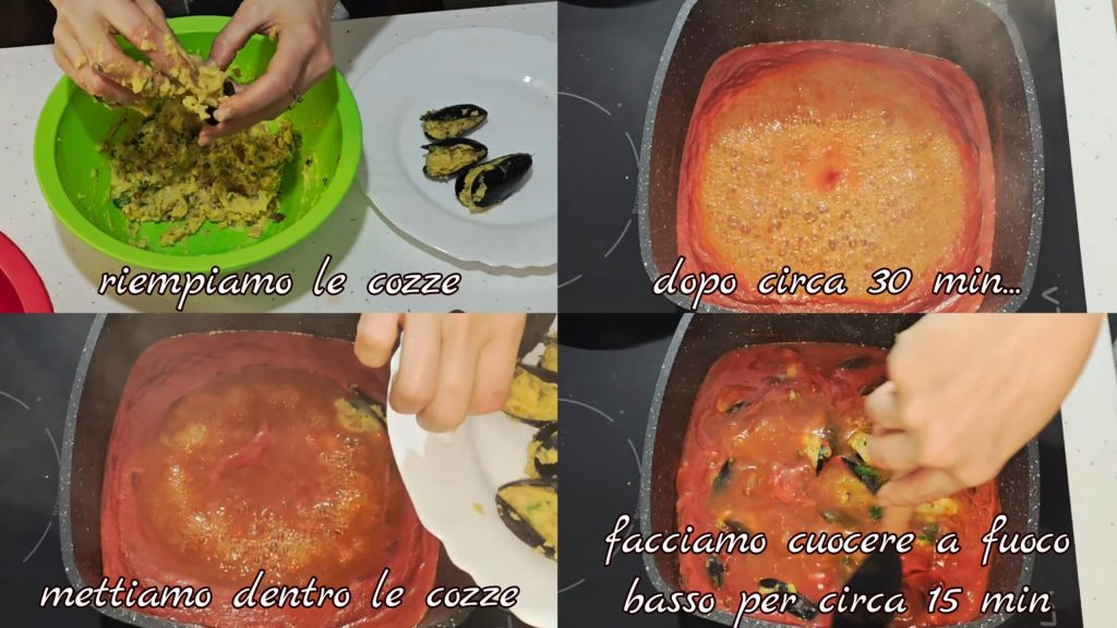 Wir füllen die Miesmuscheln nacheinander. Nach etwa 30 Minuten geben wir sie in die Sauce und lassen sie weitere 15 Minuten bei niedriger Hitze kochen.
