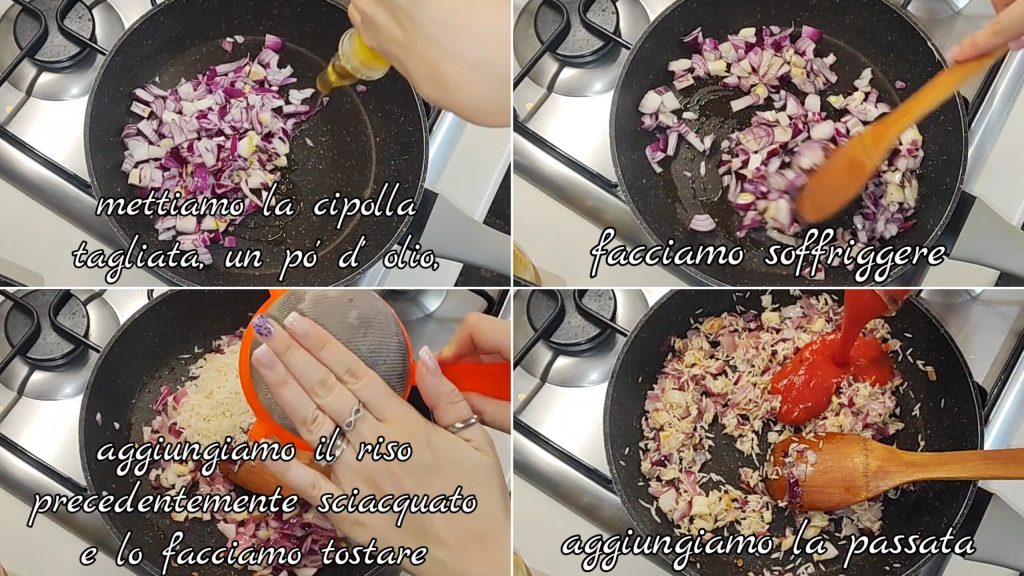 In einem Topf etwas Öl, die gehackte Zwiebel hinzufügen und anbraten. Den vorher gewaschenen Reis hinzugeben und einige Minuten anrösten. Tomatenpassata hinzufügen.