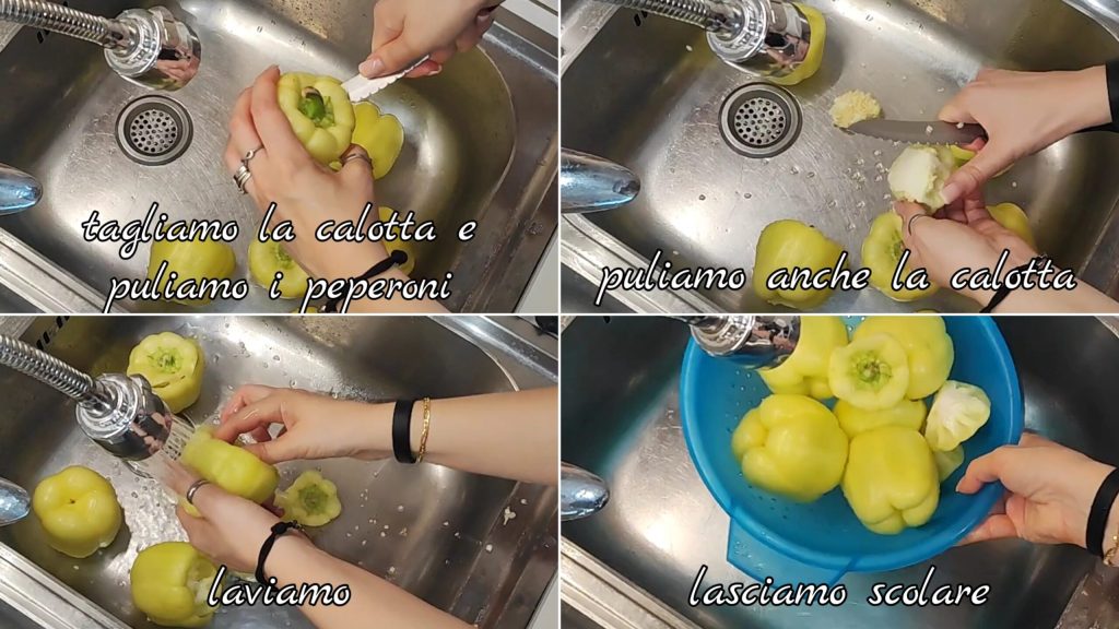 In der Zwischenzeit die Paprika waschen und putzen, indem man die Kappe abtrennt und das Innere leert. Abtropfen lassen.