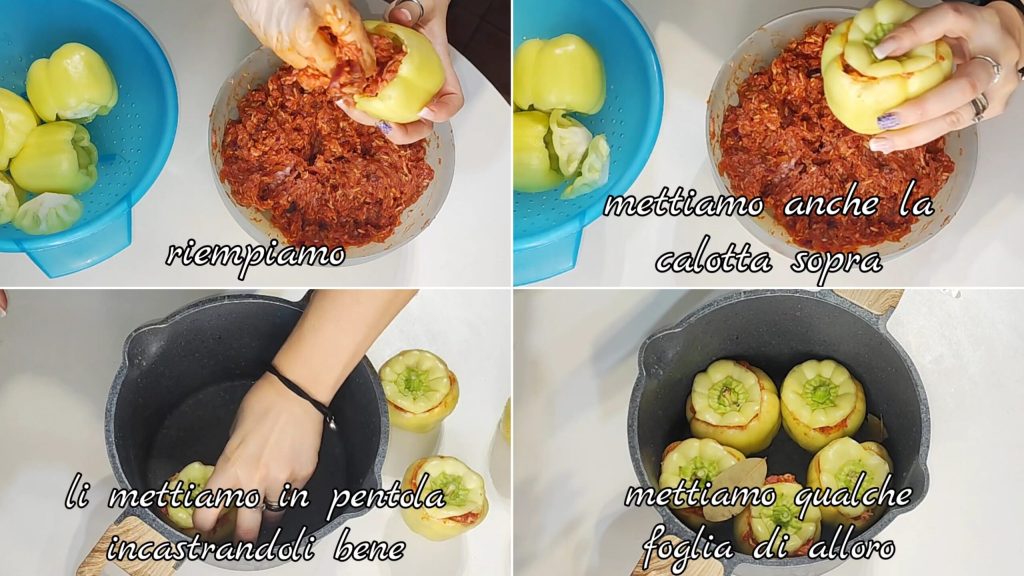 Mit der vorbereiteten Mischung füllen. Jede Paprika mit ihrer Kappe verschließen, dann in einem Topf gut anordnen, damit sie beim Kochen nicht umfallen. Einige Lorbeerblätter hinzufügen.